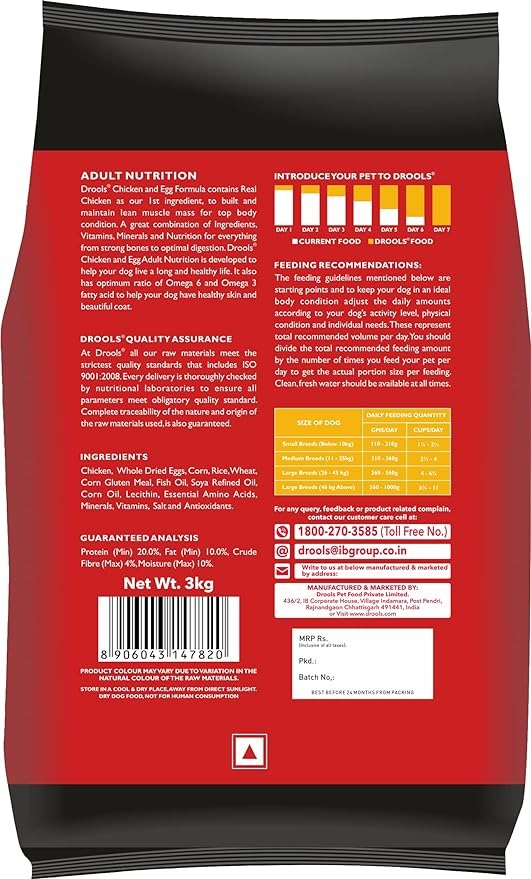 مناسب لجميع انواع الكلاب البالغةdrools طعام جاف للكلاب مع الدجاج والبيض من شركة